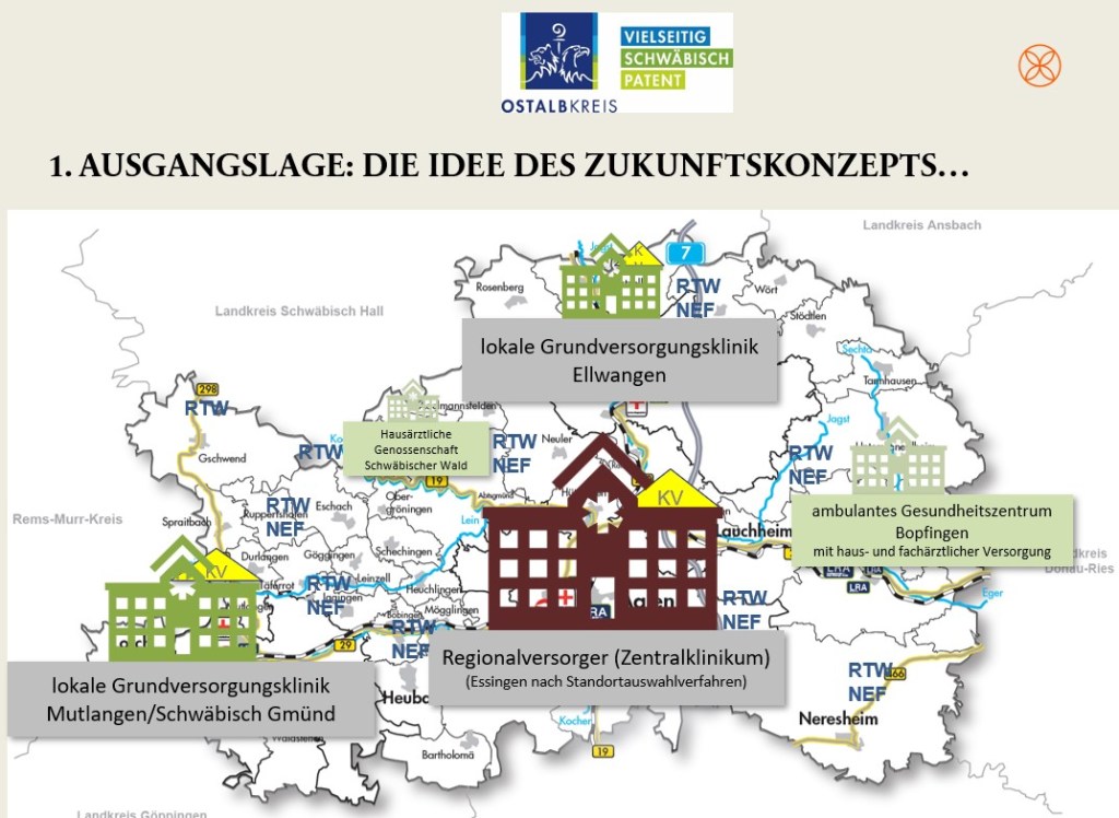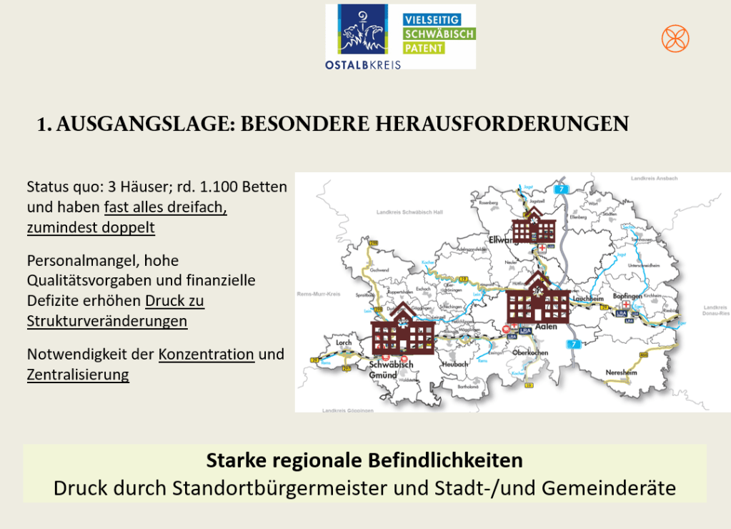 Lena Kümmel beschreibt die Ausgangslage: Im Ostalbkreis stehen drei Krankenhäuser unter öffentlicher Trägerschaft des Landkreises in der Rechtsform einer gemeinnützigen kommunalen Anstalt des öffentlichen Rechts zur Verfügung, zusätzlich zu einer kleinen Fachklinik und einer privaten Klinik. Diese drei Krankenhäuser verfügen zusammen über etwa 1.100 Planbetten, wobei die Strukturen seit den letzten 20 Jahren kaum verändert wurden. Die Krankenhäuser sind doppelt oder dreifach in ihren Angeboten aufgestellt, was ineffizient ist und zu Herausforderungen führt. Diese sind:
