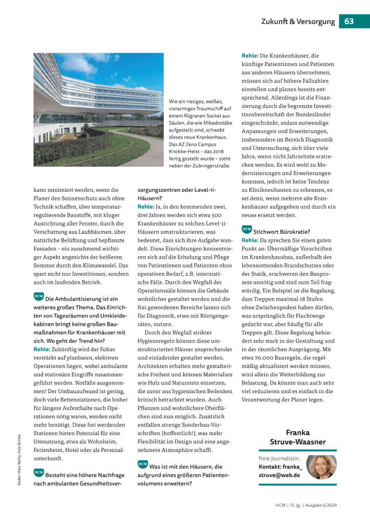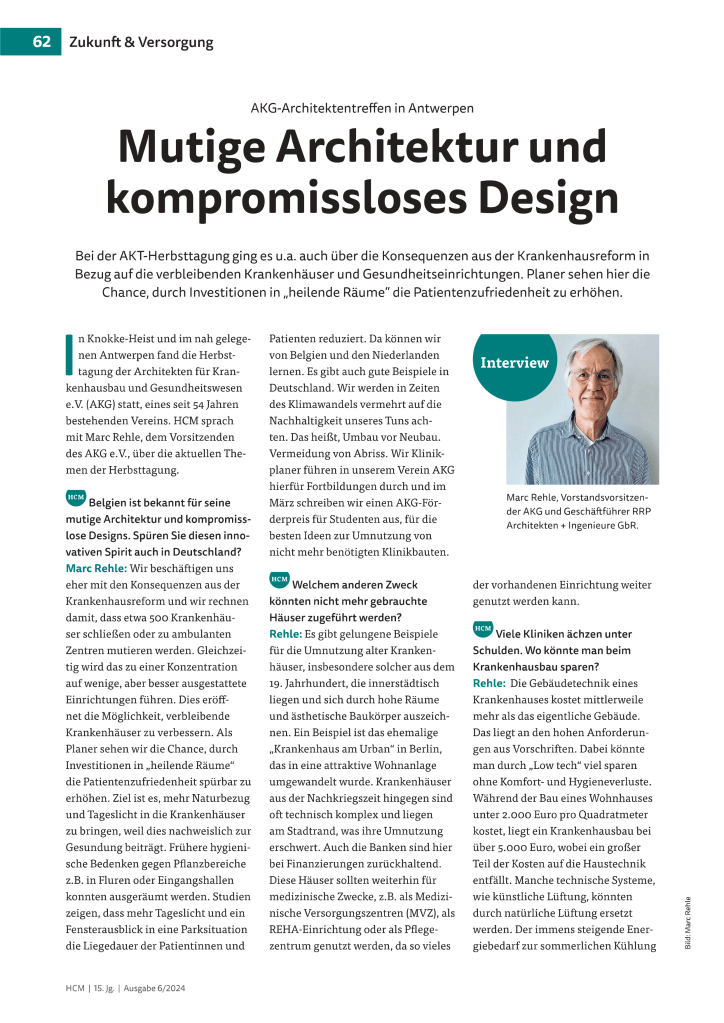 Mein Beitrag ist in Ausgabe Nr. 6 Health&Care Management erschienen. Bei der AKT-Herbsttagung ging es u.a. auch über die Konsequenzen aus der Krankenhausreform in Bezug auf die verbleibenden Krankenhäuser und Gesundheitseinrichtungen. Planer sehen hier die Chance, durch Investitionen in „heilende Räume“ die Patientenzufriedenheit zu erhöhen.
