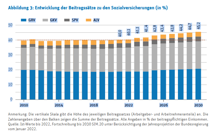 Die Beiträge zur Kranken- und Pflegeversicherung steigen dramatisch an. Für das Jahr 2025 werden Ausgaben in Höhe von mind. 345 Mrd. Euro für gesetzliche Krankenversicherungen (GKV) und 74 Mrd. Euro für die soziale Pflegeversicherung (SPV) prognostiziert. Anhand eines Simulationsmodells SIM.20 erwartet das WIP (Wissenschaftliches Institut der PKV) eine Steigerung der Beitragssätze zu den Sozialversicherungen (gesetzliche Rentenversicherung, gesetzliche Krankenversicherung, soziale Pflegeversicherung und Arbeitslosenversicherung) auf 45,2 Prozent des Bruttolohnes, bis 2030 sogar auf 45,2 Prozent.
