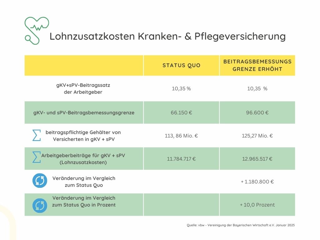 In der vbw-Studie gibt es u.a. eine Szenarioberechnung für ein Krankenhaus mit 2.881 Mitarbeitenden zum Stichtag. Die anonymisierten Daten beruhen auf realen Zahlen eines existierenden Krankenhauses der Maximalversorgung. Wenn die Beitragsbemessungsgrenze für Kranken- und Pflegeversicherung angehoben wird oder ganz entfällt, steigen für Arbeitgeber die Lohnzusatzkosten. In dem konkreten Beispiel erhöhen sich diese Kosten um zehn Prozent, rund 1,2 Mio. Euro.