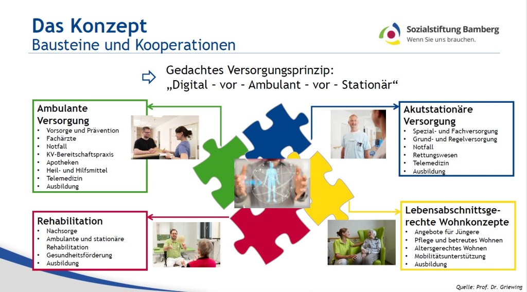 Im Zukunftsbild rücken regionale Versorgungsverbünde in den Fokus. Versorgung soll nicht mehr in isolierten Einzelhäusern organisiert werden, sondern über Kooperationen und Plattformen, die teure Parallelstrukturen abbauen, wie zum Beispiel bei Labor, Pathologie/Telepathologie, Apotheken- und Arzneimittelherstellung, Einkauf, Logistik, Energie- und Nachhaltigkeitsmanagement. Frauenknecht belegt diese Logik mit einem Praxisbeispiel: Statt ein kleines Krankenhaus „einfach zu verlieren“, kann Versorgung durch Umnutzung und Investitionen neu organisiert werden, wie in Parsberg in der Oberpfalz durch ein Demenzzentrum, ein „Haus für Gesundheit“ mit Fachärzten und ein Quartiersbüro als kontinuierliche Anlaufstelle für Bürgerinnen und Bürger.
